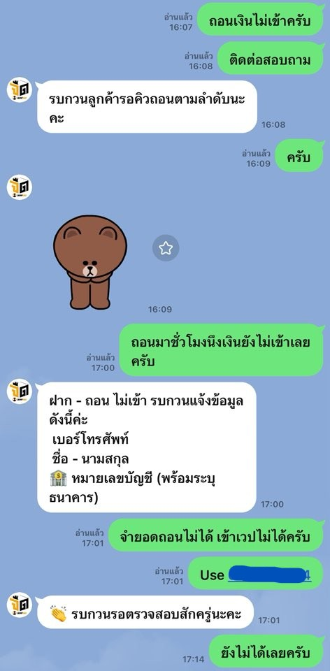เหตุผลที่โดนโกง : มุกเดิมๆ แจ้งถอนไม่โอนให้ อ้างว่ารอตรวจสอบ สุดท้ายอ้างว่าลูกค้าใช้บัค แล้วปิดยูสหนีทันที